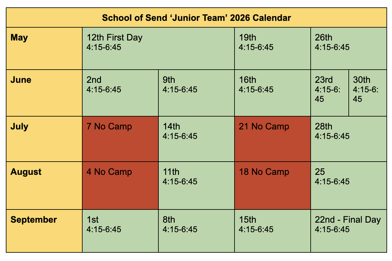 This is a rough estimate of our 2026 season calendar and subject to change. Finalized calendar will come out in April. I’ll talk with everyone who has signed up to figure out which are the best weeks to take breaks, but expect something along these lines as late summer tends to be the best time off.