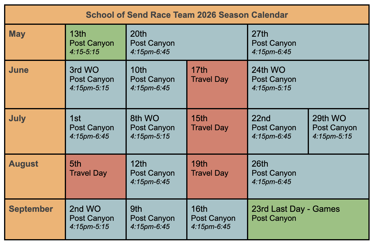 WO = Work Out/Climb Practice. This is a rough estimate of our 2026 season calendar. Subject to change.